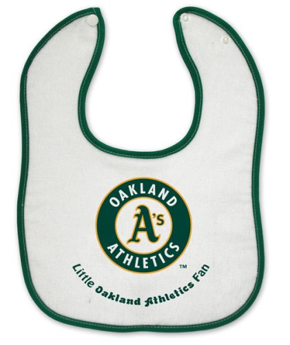 Oakland Athletics A's Baby Bib. Licensed MLB Baby Bib with Team Color Trim. 86% Cotton, 14% Polyester. Adjustable Snap. Washable, Tumble Dry.